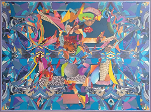 What distinguishes Balu is that he usually works totally in paper, not mixed media. With a large collection of scissors, he carefully cuts the paper, glues it to a backing, and uses a wooden roller for a seamless look.